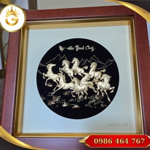 Tranh Bát Mã mạ vàng 24K kích thước vuông 30 cm là tác phẩm nghệ thuật phong thủy cao cấp, thể hiện hình ảnh “Mã đáo thành công” — hình tượng tám con ngựa mạnh mẽ phi nước đại hướng về phía trước, mang ý nghĩa thu hút tài lộc, thúc đẩy thành công và thăng tiến trong sự nghiệp. Đây là món đồ trang trí sang trọng thích hợp treo trong phòng khách, phòng làm việc lãnh đạo, phòng họp hoặc đại sảnh công ty, đồng thời cũng là quà tặng cao cấp trong nhiều dịp đặc biệt.