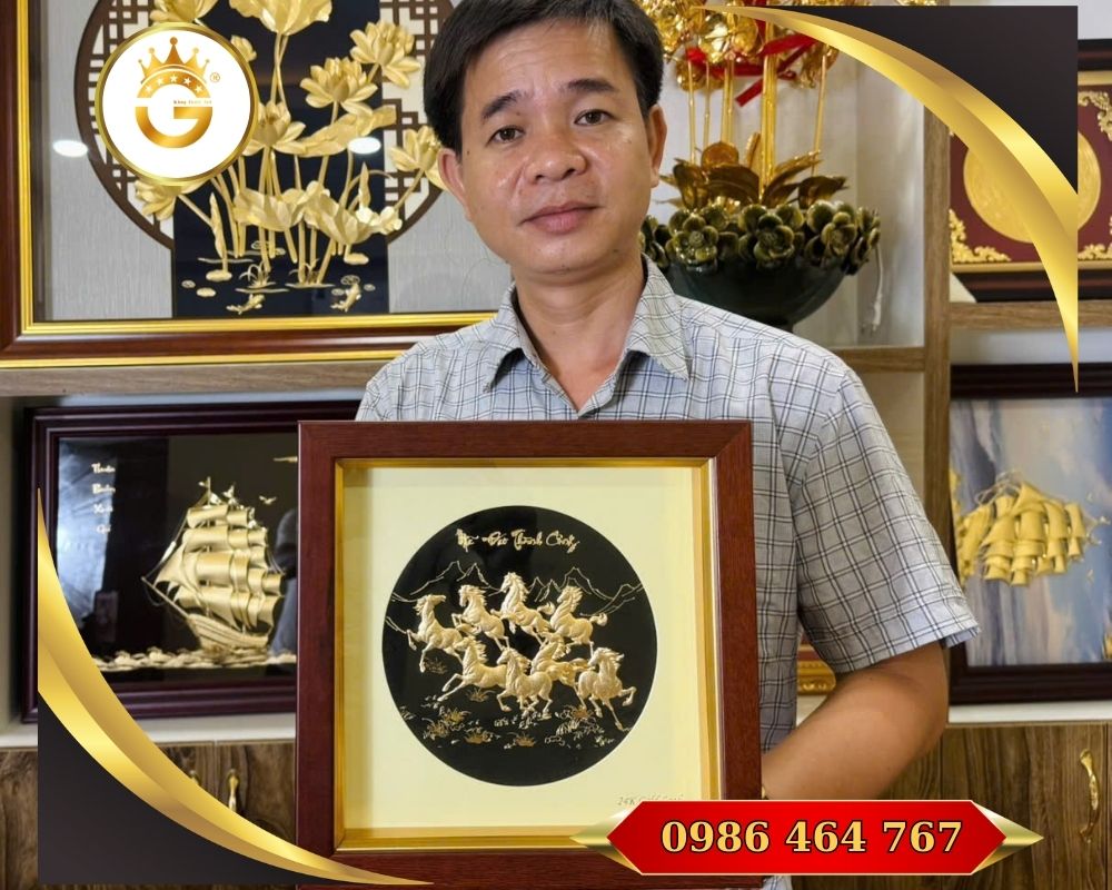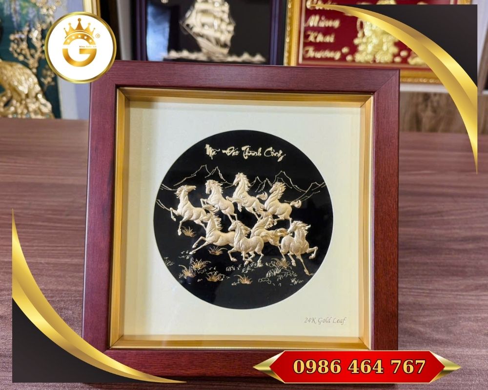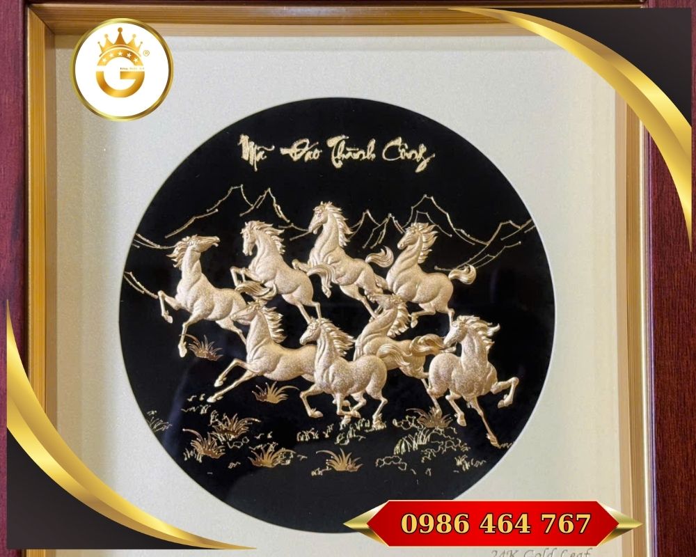 Tranh Mã Đáo Thành Công dát vàng 24K là một tác phẩm nghệ thuật – phong thủy cao cấp, được chế tác thủ công từ kim loại đồng hoặc hợp kim cao cấp, sau đó dát lớp vàng thật 24K. Bức tranh thường mô phỏng hình ảnh ngựa phi nước đại — biểu tượng của sức mạnh, tốc độ và sự phát triển — nhằm mang lại năng lượng may mắn, thăng tiến và thành công bền vững cho gia chủ hoặc doanh nghiệp.