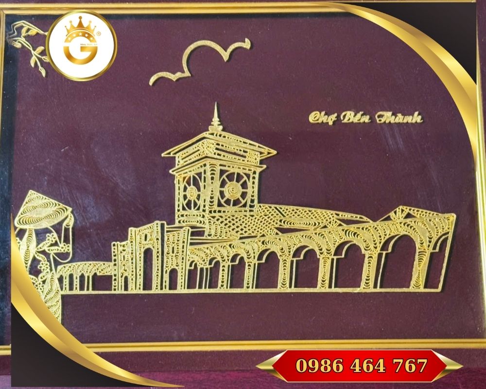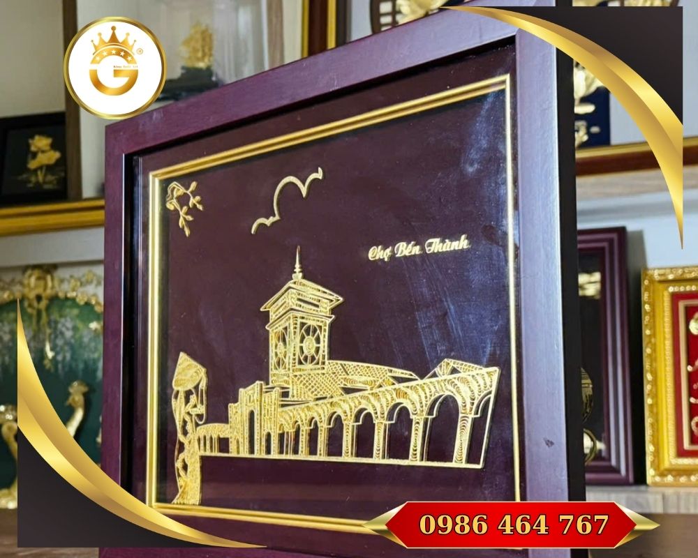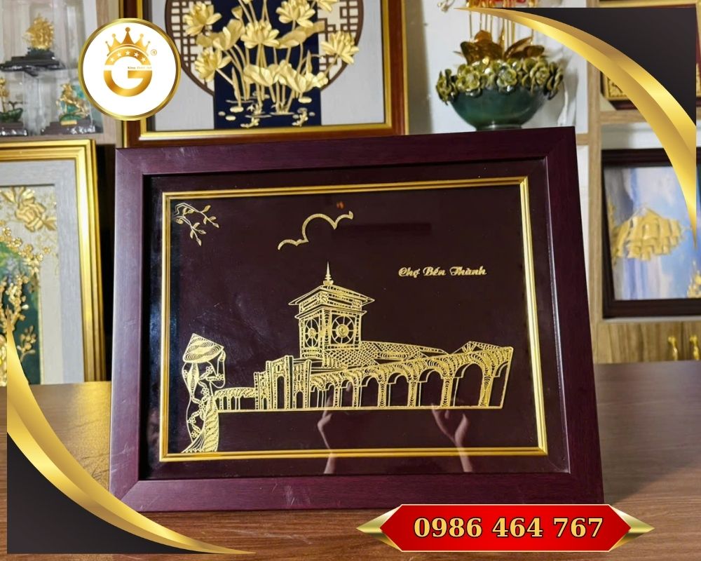 Tranh Quà Tặng Chợ Bến Thành dát vàng 24k là một tác phẩm nghệ thuật cao cấp, chế tác với lá vàng 24k nguyên chất và khung gỗ cao cấp, kích thước khoảng 35 × 45 cm. Đây không chỉ là món quà sang trọng mà còn là biểu tượng văn hóa – tâm linh – phong thủy rất phù hợp cho phòng khách, văn phòng, sảnh lễ tân hoặc làm quà tặng ngoại giao, tân gia, đối tác.