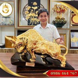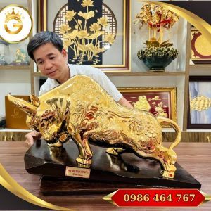 Tượng Bò Tài Chính cỡ lớn bằng đồng đỏ nguyên khối mạ vàng 24K là một trong những tác phẩm phong thủy đẳng cấp, được chế tác tỉ mỉ bởi nghệ nhân hàng đầu. Sản phẩm có kích thước lớn, trọng lượng nặng và đường nét chạm khắc tinh xảo, tạo nên hình ảnh con bò mạnh mẽ, biểu tượng của sức mạnh, tính kiên định và tài lộc bền vững. Đây là lựa chọn lý tưởng để trưng bày trong phòng làm việc, đại sảnh doanh nghiệp, phòng giám đốc hoặc dùng làm quà tặng cao cấp cho sếp, đối tác và khách VIP.