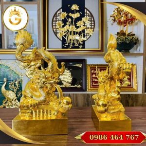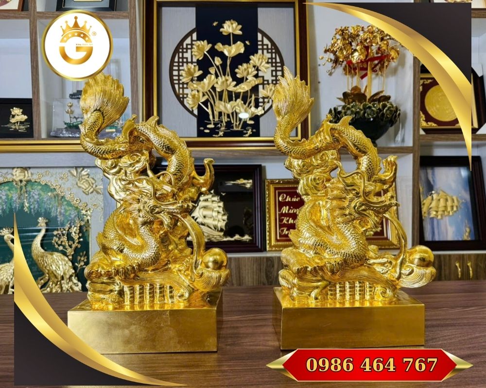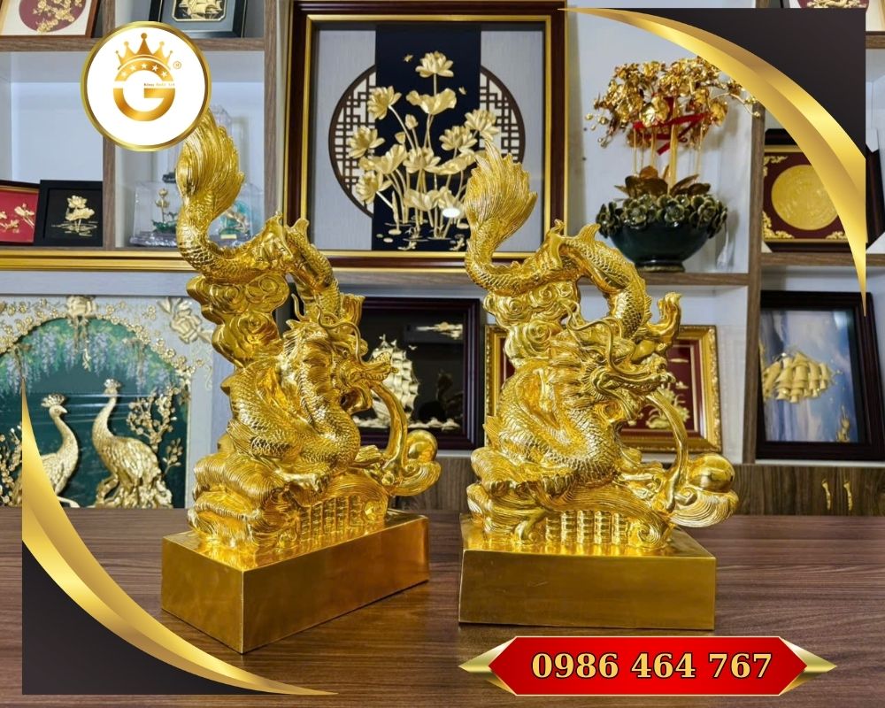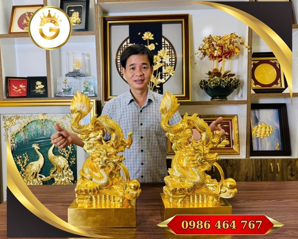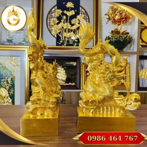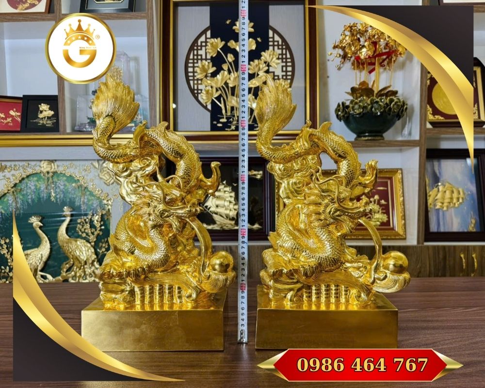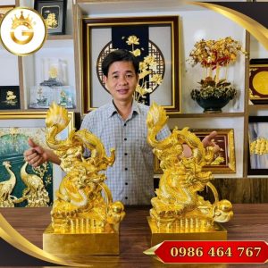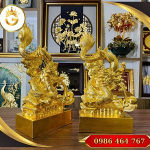 Tượng Rồng Nhả Ngọc dát vàng 9999 là một trong những linh vật phong thủy cao cấp nhất hiện nay, được chế tác từ đồng nguyên chất và phủ lớp vàng 9999 sang trọng. Hình ảnh rồng uốn lượn oai phong, miệng nhả ngọc biểu thị cho sự khai mở trí tuệ, chiêu tài hút lộc và quyền năng tối thượng.