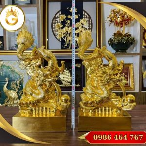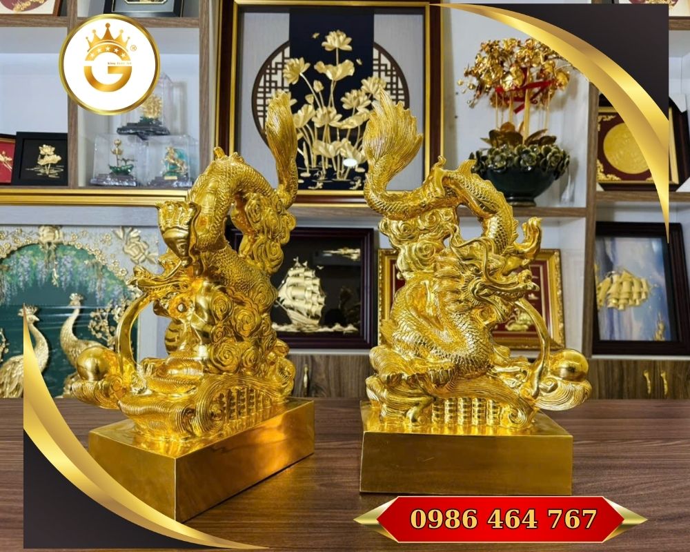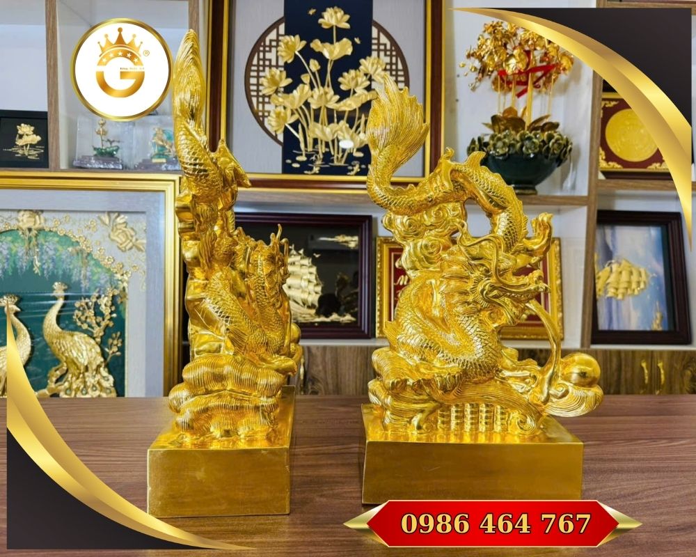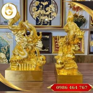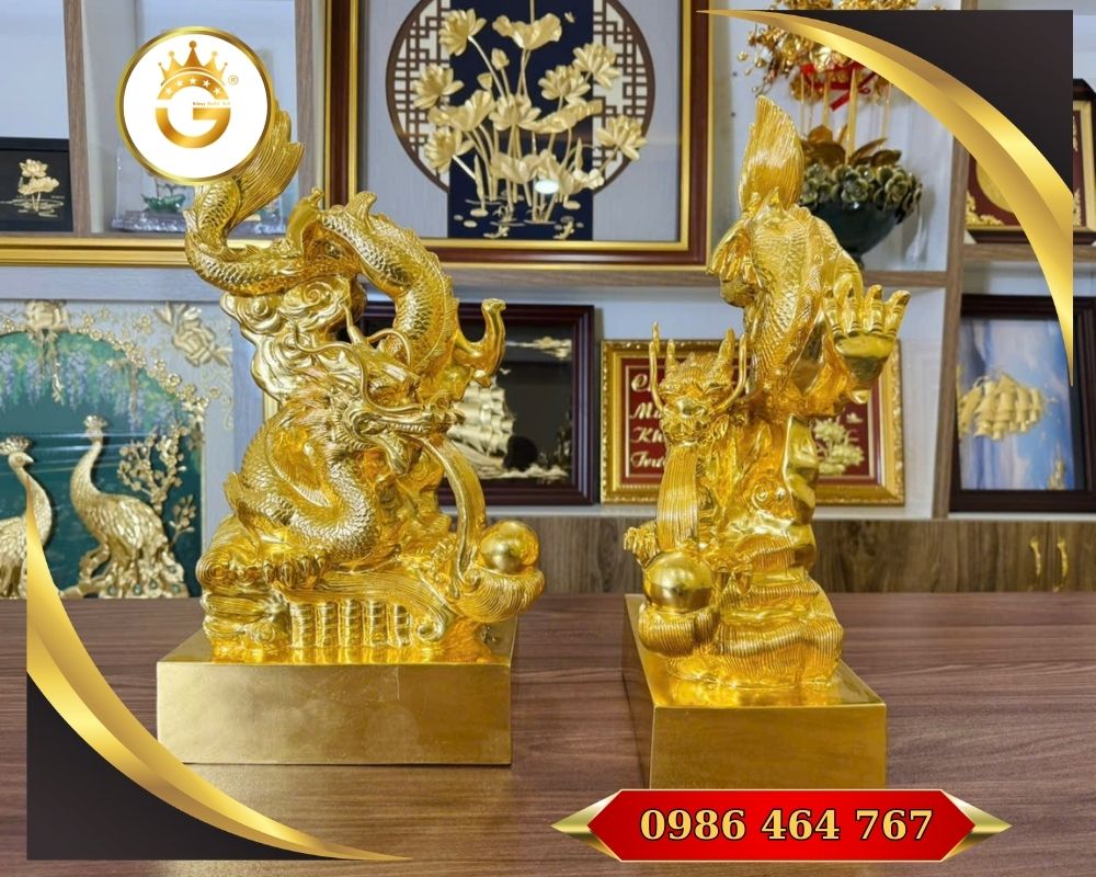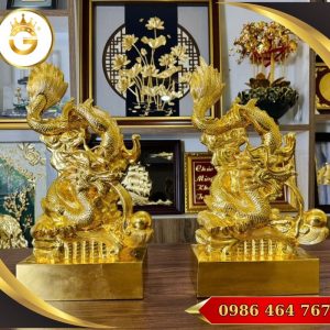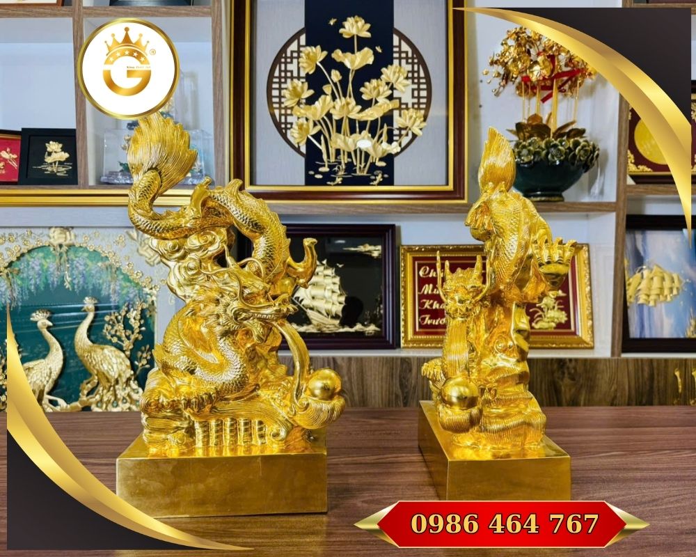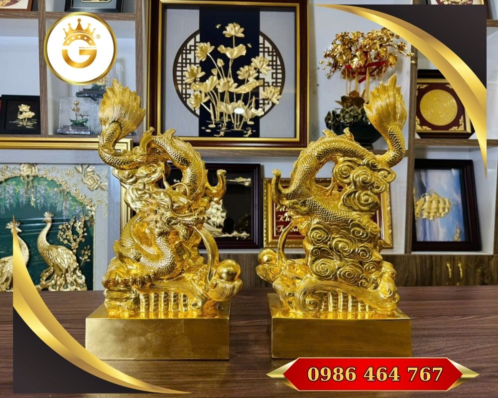Tượng Rồng Nhả Ngọc dát vàng 9999 là một trong những linh vật phong thủy cao cấp nhất hiện nay, được chế tác từ đồng nguyên chất và phủ lớp vàng 9999 sang trọng. Hình ảnh rồng uốn lượn oai phong, miệng nhả ngọc biểu thị cho sự khai mở trí tuệ, chiêu tài hút lộc và quyền năng tối thượng.