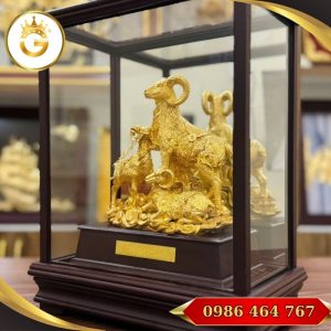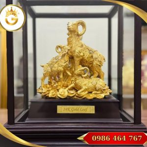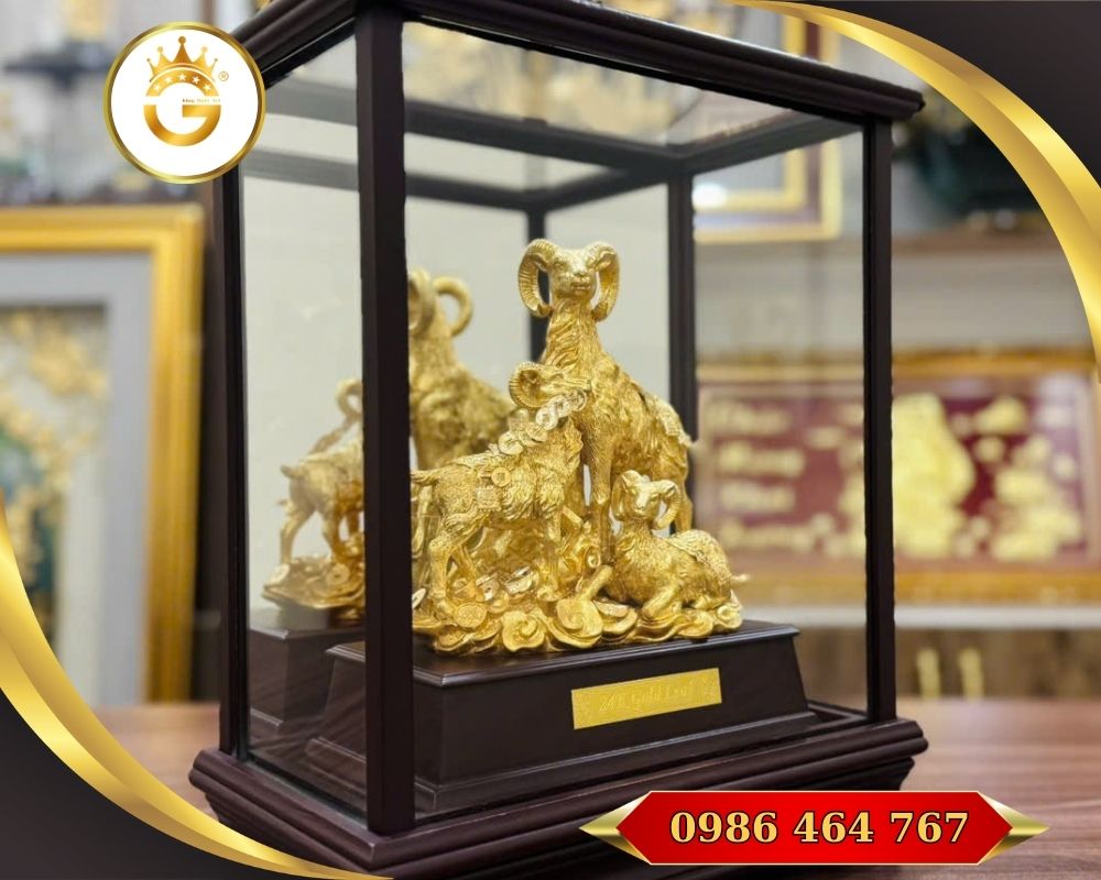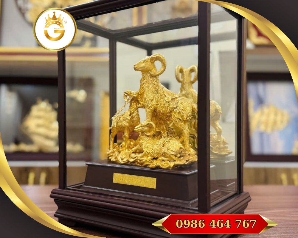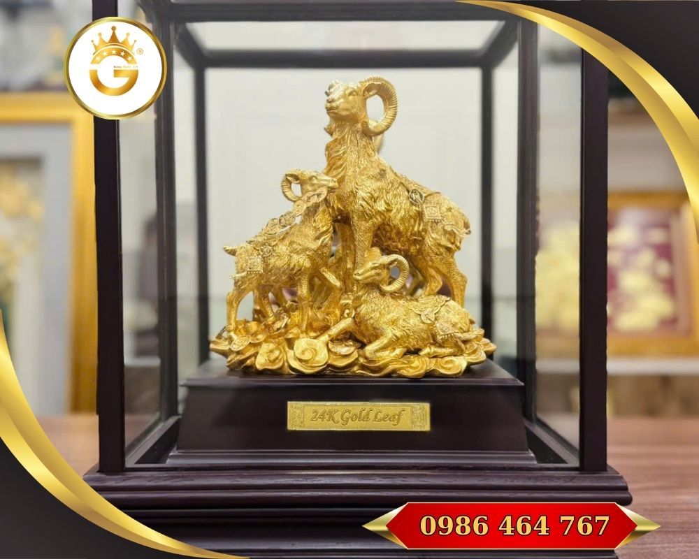 Kết hợp decor: có thể phối với đèn chiếu nhẹ, khung tranh nền tường màu trung tính, cây xanh nhỏ — làm nổi bật vẻ sang trọng của vàng và sự ấm cúng của dê.